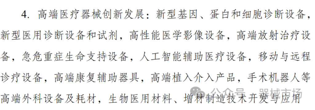 具体包括:新型基因、蛋白和细胞诊断设备,新型医用诊断设备和试剂,高性能医学影像设备,高端放射治疗设备,急危重症生命支持设备,人工智能辅助医疗设备,移动与远程诊疗设备,高端康复辅助器具,高端植入介入产品,手术机器人等高端外科设备及耗材,生物医用材料、增材制造技术开发与应用。