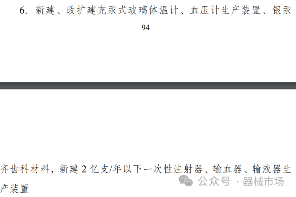 在第二类“限制类”第十项“医药”类中,涉及到的医疗器械产品包括:新建、改扩建充汞式玻璃体温计、血压计生产装置、银汞94齐齿科材料,新建2亿支/年以下一次性注射器、输血器、输液器生产装置。