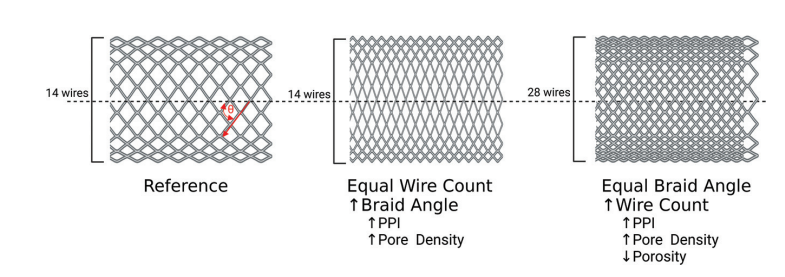 工程师可以调整许多FD编织几何设计参数。首先是编织内单根金属丝的直径。增加金属丝直径会增加器械的整体强度,提高张开力和径向抗压能力。然而,这种改善的张开力是以增加输送力为代价的,并且可能需要更大的微导管内径进行输送。较大的金属丝直径可能与延迟的内皮化以及血栓栓塞的风险相关,就像较大的冠状支架支柱一样。然而,这种关系在FD应用中尚未得到广泛研究。市场批准的FD通常具有约18-35μm(约0.0007-0.001英寸)范围内的金属丝直径。