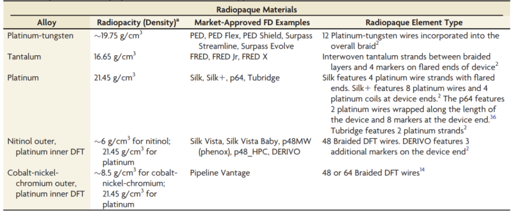 钴-镍-铬和镍钛代表了基于它们的机械性能而选择的优秀材料,但它们的不透射线度较低。相对高不透射线密度的材料,如钽、铂或铂-钨合金,被用于提供比钴-镍-铬或镍钛等材料更好的显影性,以帮助在透视引导下进行输送。所有市场批准的FD都在其结构中加入了某种不透射线元素。例如,PED和Surpass Evolve在它们的编织中采用了铂-钨丝,而FRED则在器械的两端附有钽标记,并在层之间采用统一的钽丝。传递不透射线性的另一种方法是使用DFT丝。DFT丝包含一个内芯丝,通常由不透射线的铂或钽组成,外层包裹着镍钛或钴-镍-铬合金。由DFT丝构建的FD旨在在整个器械长度范围内提供均匀的不透射线性,同时利用镍钛或钴-镍-铬合金的优势机械性能。Silk Vista Baby(Balt)和DERIVO FD(Acandis)是采用镍钛外层/铂内芯DFT丝构建的CE批准FD的示例。Pipeline Vantage则采用了钴合金外层/铂内芯DFT丝。表1和表2总结了材料特性以及由传统FD材料构建的市场批准FD的示例。
