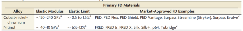 表1. 市场批准FD中使用的基材的性能。a:在应用建模值时要适当考虑杨氏模量和弹性极限(对于镍钛来说是伪弹性)可能会因工艺结构、纹理和强度结果而有很大差异。这里给出的是现实的可能结果,取决于供应商的生产路径和目标结果。