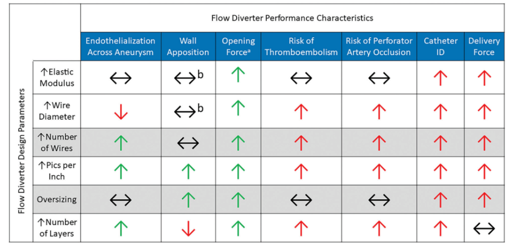 通常情况下,血流导向装置(FDs)是通过在芯轴周围编织一组36-96根金属丝,并对其进行热处理以锁定形状而制成的。然后移除芯轴,留下金属网状管,再将其切割成所需长度。器械随后可能会进一步加工,包括固定松散的金属丝端部、添加放射性显影标记,或处理器械表面。最后,将器械装入其输送系统中。尽管FDs的总体构造在概念上很简单,但涉及许多设计参数,包括金属丝直径、编织中的金属丝数量、金属丝材料的选择等,所有这些都会影响器械性能。选择其中一个设计参数可能会对FD的一个性能特征产生积极影响,同时对另一个性能特征产生负面影响。FD工程师的任务是选择参数,找到一个平衡点,以优化介入医生认为最重要的性能特征。FD设计参数与性能影响之间的关系总结在图1中。
