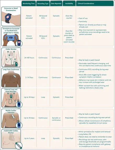当需要持续心电图监测时,动态心电图监测可能很有用。持续监测可以评估心房颤动负荷(心房颤动时间相对于监测时间的百分比)、抗心律失常的有效性和安全性,以及心房颤动的心率控制,这在患者不知道心动过速或心房颤动时特别有用。动态心电图监测有多种设备配置,这些配置针对特定用例量身定制,具体取决于使用持续时间(24 小时至 30 天)、单个或多个心电图向量、导联或贴片系统、连续或非连续记录以及传输和解释的及时性(图 3)。当这些设备通过无线连接与蜂窝中继集线器配对时,它们可以在佩戴期间传输患者触发的心电图或设备检测到的节律,从而有可能由可能全天 24 小时可用的技术人员进行快速审查。一些使用贴片的心电图监测设备还包括更连续地记录和传输心电图测量值、呼吸频率和皮肤温度,从而支持在患者家中提供的急性护理,也称为家庭医院监测。