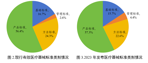 按标准规范对象统计,现行有效的医疗器械标准中基础标准330项,占比16.7%;管理标准51项,占比2.6%;方法标准480项,占比24.3%;产品标准1113项,占比56.4%(见图2)。2023年发布基础标准25项,占比15.7%;管理标准7项,占比4.4%;方法标准36项,占比22.6%;产品标准91项,占比57.3%(见图3)。