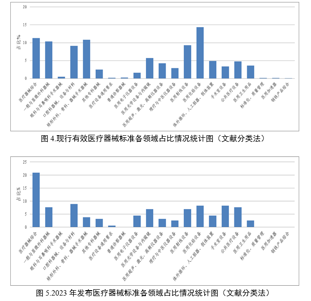 按《中国标准文献分类法》分类统计,现行有效的医疗器械标准全面覆盖了医疗器械各技术领域,主要集中在医用化验设备C44(占比14.3%),医疗器械综合C30(占比11.3%),矫形外科、骨科器械C35(占比10.8%),一般与显微外科器械C31(占比10.4%);2023年发布标准覆盖医疗器械综合C30、口腔科器械、设备与材料C33等16个标准类别,医疗器械综合类标准发布数量最多,占比达到当年发布标准的20.9%。各领域标准占比分布见图4—5。