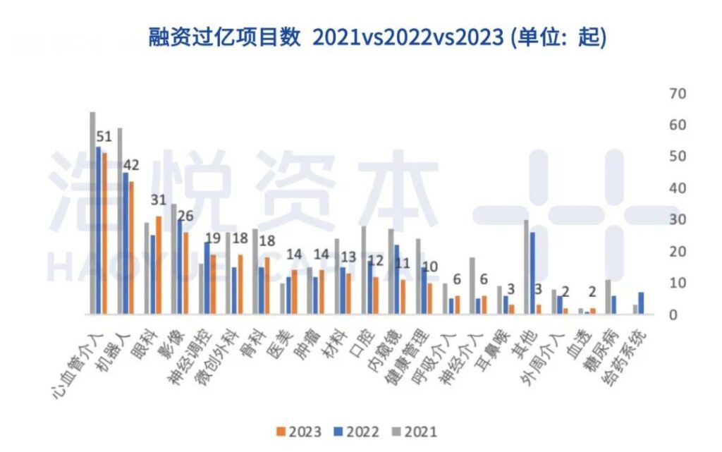 所有细分赛道中,心血管介入、机器人和影像稳居前三的格局被打破,眼科赛道首次超过影像,勇夺探花。值得注意的是:医美在2023年首次进入前十大赛道,交易数量达到14起;从排名上看,微创外科与骨科受欢迎程度有所上升;有人欢喜有人愁,口腔则意外跌出前十。