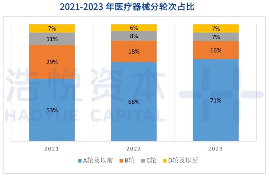 回顾2023年私募融资交易轮次,早期器械私募融资交易(A轮及以前)达到了201起,占比2022年全年私募融资项目总数(有明确轮次的项目)达到71%,为三年历史最高水平,B至D轮融资数量持续降低。