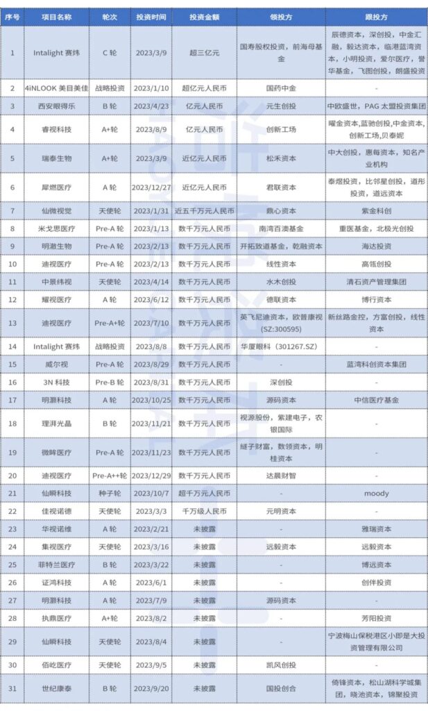2023年眼外科领域私募融资交易数量达19起,与2022年基本持平,融资轮次主要集中在天使轮到A轮,金额以数千万元为主,整体行业标的依然是小散乱格局,且企业发展阶段偏早期。