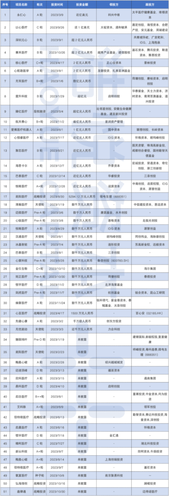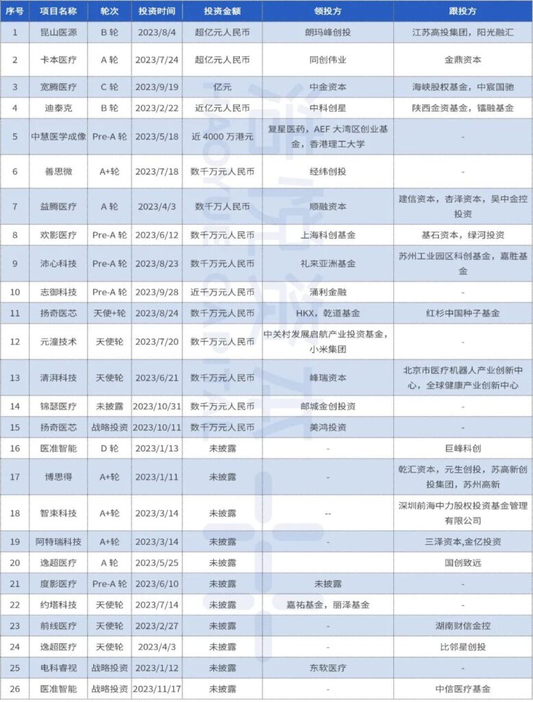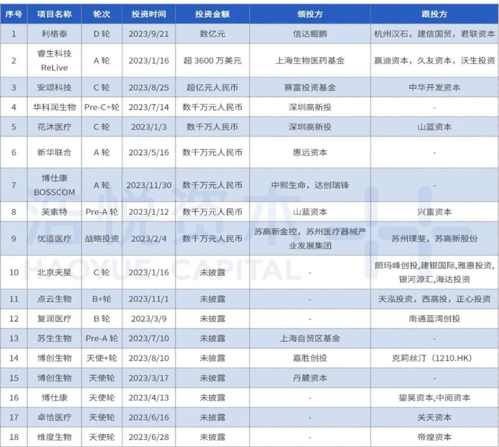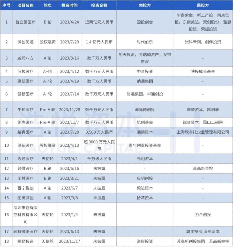 除了以上融资交易数量前6名的赛道外,前12名还有神经调控赛道19起(22年21起),肿瘤赛道15起(22年12起),医美赛道14起(22年12起),材料赛道13起(22年15起),口腔赛道12起(22年17起),内窥镜赛道11起(22年22起)。
