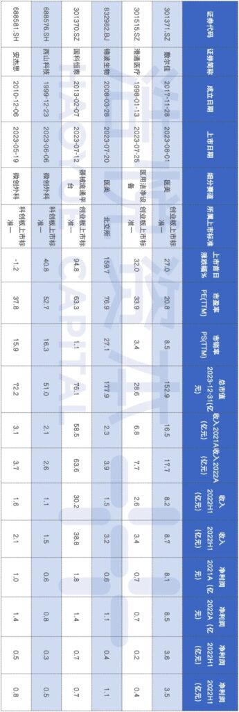 如表所示:2023年成功上市的企业,赛道偏好弱化,更突显了收入体量及盈利性的指标,过往通过18A走非盈利上市的路径基本很难实现,整个上市考评体系更注重对于盈利性的考核。当然具有强科技属性的企业,在有营收未实现盈利的情况下,仍有科创板二套、北交所、港股板块可以考虑。更偏传统的微创外科耗材、有源设备等领域确实在上市方面有商业化体量优势,全球创新尚未商业化的企业将受到严峻考验,注册制不代表证监会放松审查,而是鼓励大浪淘沙后的“实力派”企业: “打铁必须自身硬”,只要企业修炼好内功,上市只会是时间周期长短的问题。