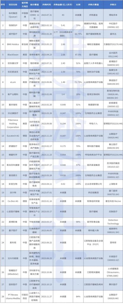 虽然2023年IPO市场跌宕起伏,私募融资数量也较22年明显下降。在二级市场探底并传导一级市场的背景下,并购交易反而逆市保持稳中有升,也说明成熟赛道的医疗器械玩家,已经意识到需要通过抱团取暖,争取最大化的规模化增长机会和赛道位次的竞争格局重构。医疗器械并购趋于侧重管线协同搭建平台企业、渠道资源整合提高终端业务效能,以及并表提高营收规模的综合实力等产业组合拳的打法。并购重组带来的:盈利能力、业务拓展、战略布局等能力要素,越来越被一二级市场企业践行,差异化的加速各自赛道的洗牌,具备核心护城河的企业才能在资本寒冬中平稳过渡,韬光养晦,一鸣惊人。