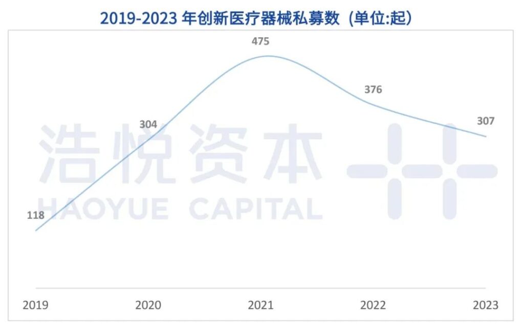 2023年行业持续震荡,但相较于其他行业,医疗器械融资融资依然表现得相对“抗寒”:投融资在数量上相比2022年略有下滑,截止2023年底,器械私募融资交易数量有307起,相比于2022年的376起,同比下降18%,与巅峰时刻2021年的475起相比有35%的下滑,但仍然高于2020年。