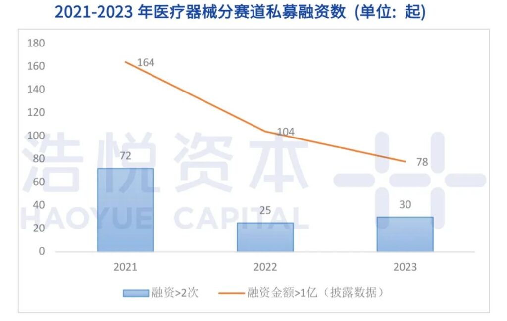 数量的降幅仍在意料之中,甚至超过期待,但深度剖析,我们发现,融资的规模整体有所缩水,金额过亿的项目数持续下滑,从2021年的164例腰斩至2023年的78例,其中金额较高的数亿元的融资事件数量也有明显减少,但同年融资次数超过2次的公司数量却有所提升,+轮、++轮的融资案例也频繁出现,这些现象指向一个趋势,医疗器械企业在资本寒冬之下正在采取“小步快跑”的融资策略。
