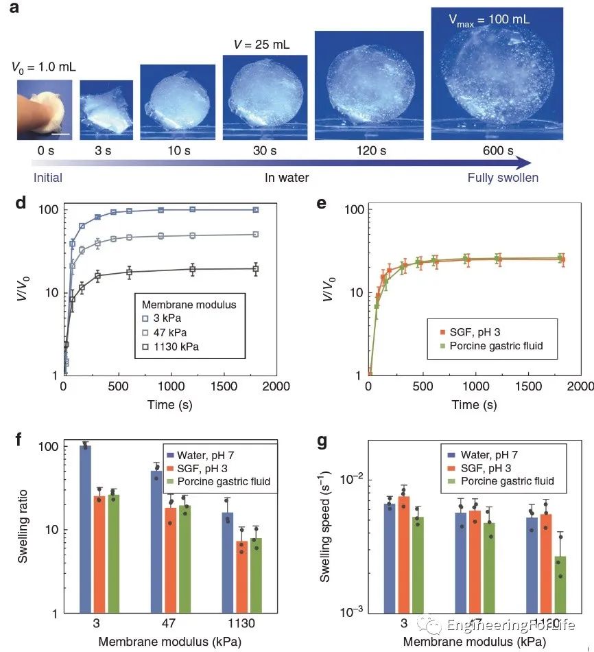 图3 PVA水凝胶的溶胀性能探究(溶胀直观变化图及不同模量水凝胶、在不同溶液介质中的溶胀行为研究)