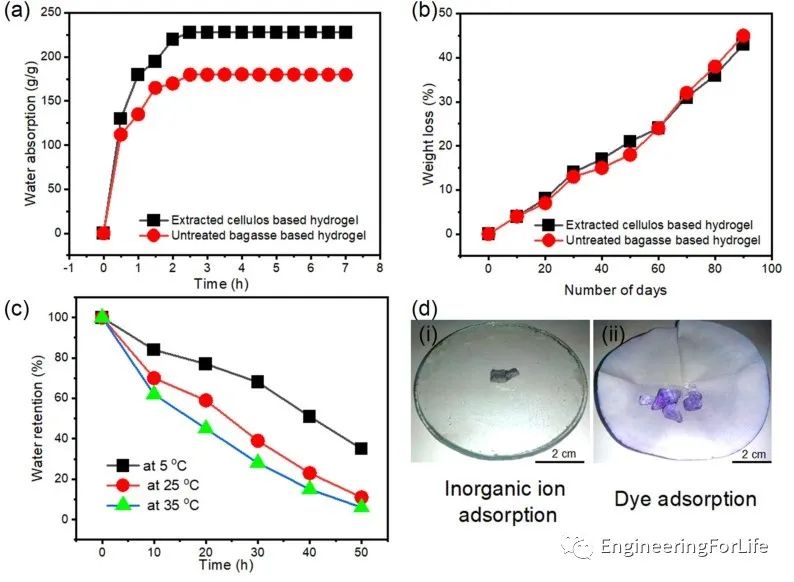 图4 a.甘蔗渣基水凝胶的吸水率探究;b.水凝胶的降解性能;c.水凝胶在不同温度下(5/25/35 ℃)的保水特性;d.水凝胶对重金属离子及颜料的吸附性