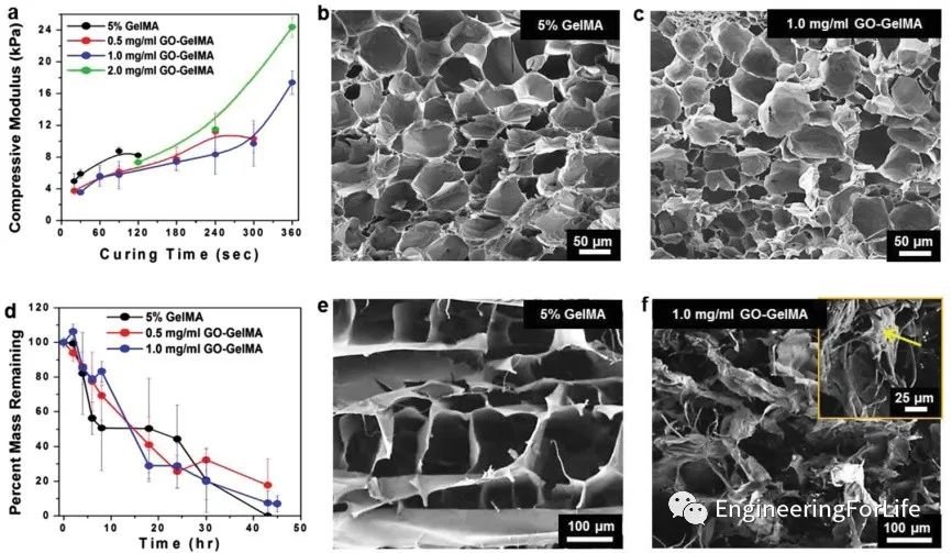 图5 GelMA/GO复合水凝胶的降解行为:a.水凝胶压缩模量随GO浓度和光固化时间的变化曲线 b/c. GelMA/GO水凝胶的SEM图; d.不同GO浓度的水凝胶暴露于胶原酶的降解情况;e/f.胶原酶作用24小时后,GelMA/GO水凝胶的SEM图