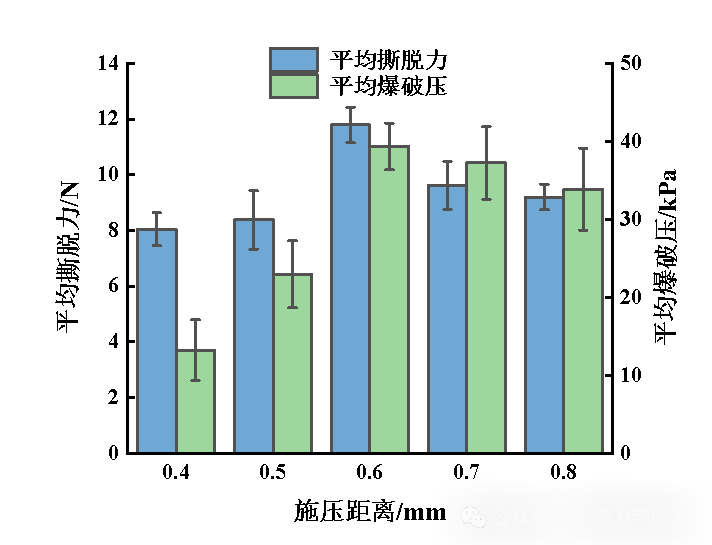 为了研究施压距离与吻合口强度之间的关系,本文进行了撕脱力和爆破压实验。随着施压距离的增大,吻合口的力学性能逐渐增强,当施压距离为0.6 mm时,达到最大吻合强度,此时组织的撕脱力为(11.79±0.64) N,爆破压为(39.32±2.99) kPa,远大于文献中血管极限拉伸时的轴向拉力,同时,达到病理性收缩压的范围。随着施压距离的进一步增加,吻合口力学性能开始下降。当施压距离为0.4 mm时,组织的爆破压为(13.25±3.87) kPa,小于正常情况下人的生理动脉压,而其他施压距离下,组组织的爆破压均高于生理动脉压(见图3)。