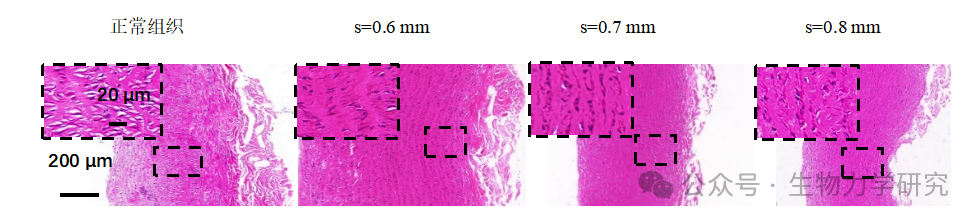 观察吻合后的组织微观结构,正常组织的弹性纤维和和胶原纤维呈现出网状结构,外膜为疏松的结缔组织。而组织受到挤压后,内部结构变得紧密。当施压距离为0.6、0.7 mm时,组织的平滑肌细胞排列有序。当施压距离为0.8 mm时,由于组织受到过度的挤压,导致细胞排列发生紊乱(见图4)。
