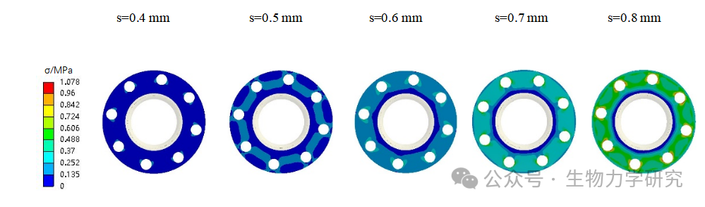 图1 不同施压距离(s)下吻合端面的内表面应力分布