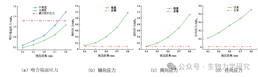 在正常血压状态下,血管主要受到轴向、周向和径向的应力,其中轴向和周向应力的量级为0.1 MPa(拉力),径向应力量级为0.01 MPa(压力)。因此,吻合器对血管组织在3个方向上施加的应力应大于正常情况,才能达到良好的吻合。本文结果显示,在不同施压距离下,吻合端面在轴向和径向应力均大于生理状态下的拉(压)力[见图2(b)、(d)],而当施压距离为0.4 mm时,其周向应力小于生理状态下的压力,不满足良好吻合的条件[见图2(c)]。