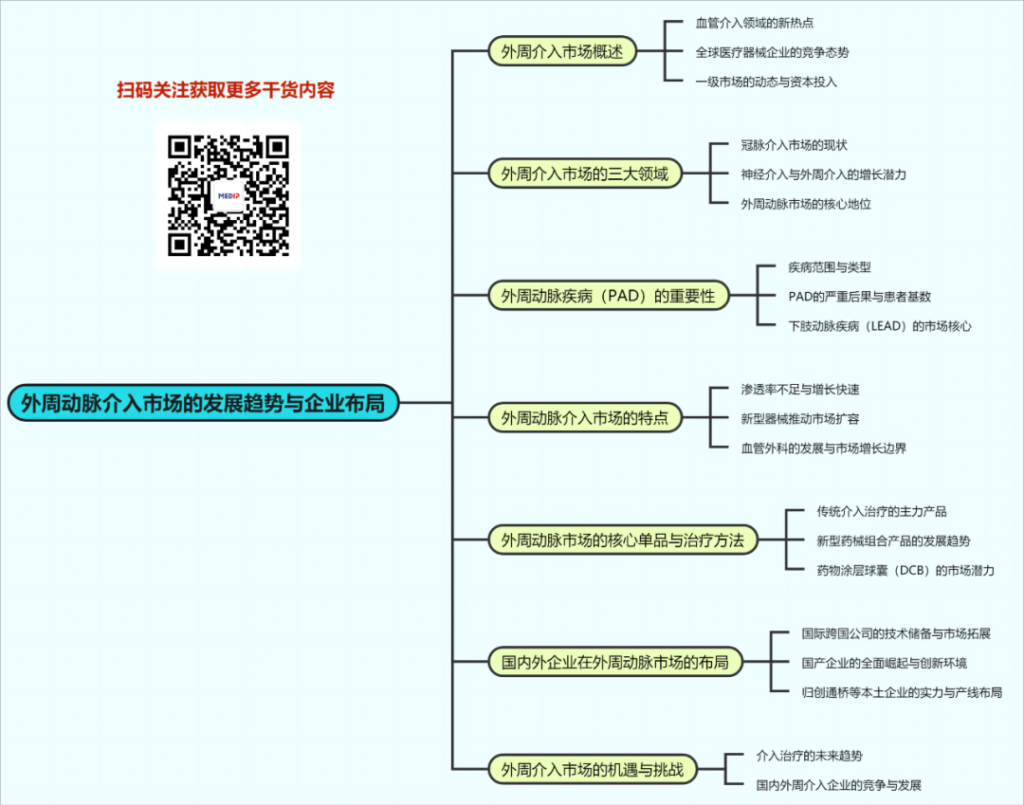 外周介入市场的吸引力在于其庞大的患者基数和广阔的市场增长潜力。相比于冠脉介入和神经介入,外周介入涉及的疾病类型更为多样,术式更为复杂,因此专用治疗器械的种类也更加丰富。这意味着外周介入市场有着更多的增长点和掘金机会。
