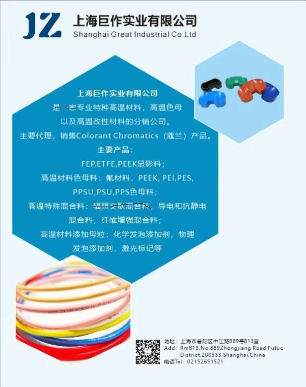 上海巨作实业有限公司是一家专业特种高温材料,高温色母以及高温改性材料的分销公司。主要代理,销售Colorant Chromatics(蔻兰)产品。主要产品:FEP,ETFE,PEEK显影料;高温材料色母料:氟材料,PEEK, PEI,PES,PPSU,PSU,PPS色母料;高温特殊混合料:辐照交联混合料,导电和抗静电混合料,纤维增强混合料;高温材料添加母粒:化学发泡添加剂,物理发泡添加剂,激光标记等