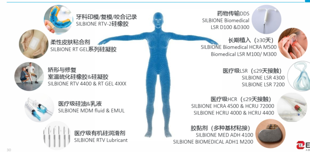 应用领域有:齿科印模材,柔性皮肤粘合剂硅凝胶,矫形与修复室温硫化胶,医疗级硅油,乳液,润滑涂层,医疗级<29天接触液体固体硅胶,粘接剂,药物传输,蠕动泵。