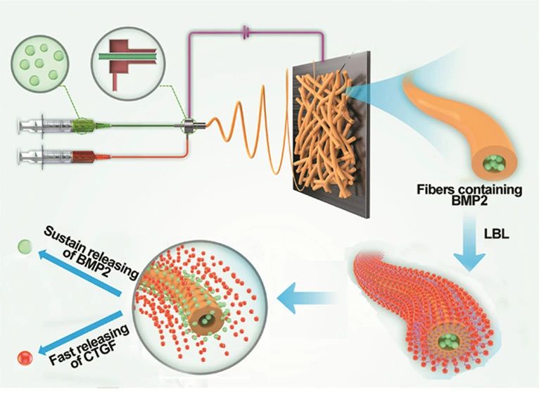 骨愈合是一个复杂的再生过程,涉及多种因子的协同作用。其中,在骨折部位处成骨细胞会分泌骨形态发生蛋白2(BMP2)和结缔组织生长因子(CTGF),进而刺激体内自身修复的机制。BMP2是具有软骨内骨生成和诱导成骨细胞分化作用的细胞外信号分子,具有强大的促成骨活性,常被用于骨损伤修复的研究促进成骨细胞生成和新骨形成,并被广泛用作治疗骨骼疾病的治疗性生长因子。CTGF是富含半胱氨酸的蛋白质,有利于骨髓基质干细胞的粘附和迁移,在软骨内和膜内骨化中起重要作用。在缺失CTGF小鼠的骨缺损中,成骨细胞成熟慢且矿化迟缓,造成骨骼异常。该研究中开发了一种具有双因子递送功能的纳米纤维载体,实现CTGF瞬时释放和BMP2持久释放的功能,用来模拟体内骨缺损自修复的生化环境,有利于探究这种双因子协同作用的意义。