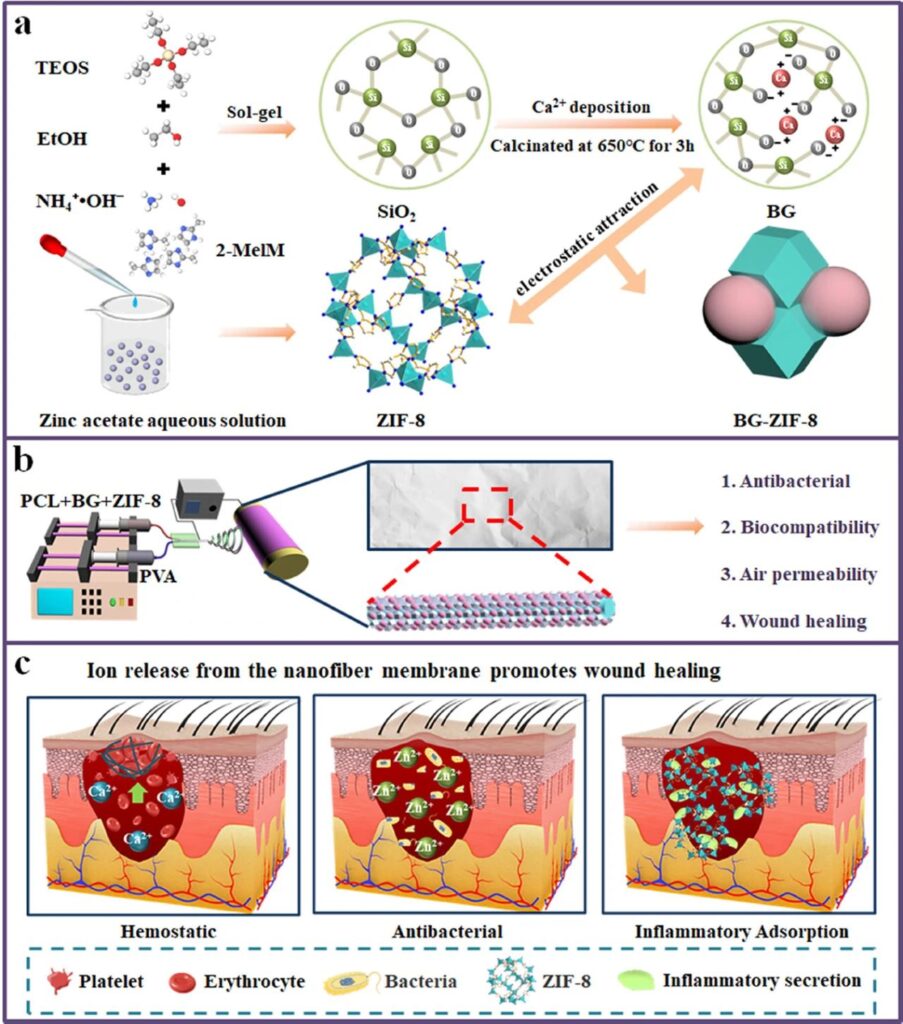 图5. (a) BG和ZIF-8的合成图。(b)合成葫芦串纳米纤维的示意图。(c)皮肤支架促进创面愈合的机制图。