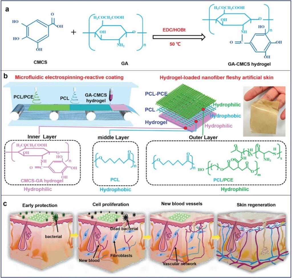 皮肤复杂的伤口修复过程和微环境,创伤修复与再生是组织工程的研究重点,亦是全球生命健康领域的难题。尽管人造皮肤材料,如猪皮、“软湿”水凝胶、纳米纤维支架材料等已有报道,然而在微环境的调控以及肉感人造皮肤制备方面仍然是挑战。针对上述挑战,医疗器械行业展览Medtec了解到,研究人员创新性地结合静电纺丝与原位反应成膜方法将纳米纤维与凝胶复合,构筑了凝胶负载的纳米纤维肉感人造皮肤材料,该皮肤为加速伤口愈合提供了良好的微环境。采用静电纺丝技术制备了疏水亲水的PCL/PCL-PCE(PCL=聚己内酯,PCE =聚柠檬酸-co-聚赖氨酸)双层纤维膜,然后在疏水的PCL纤维膜表面原位反应形成亲水的凝胶层,从而获得了凝胶负载疏亲水纳米纤维人造皮肤材料。它不仅具有水凝胶和纳米纤维的透气性好、机械强度高、抗菌性能好、相容性好等优点,而且在外观、质地、功能等方面与真实皮肤相媲美。该肉感人造皮肤具有体液管理能力,可以在创面处建立良好的微环境,大大加快创面愈合。