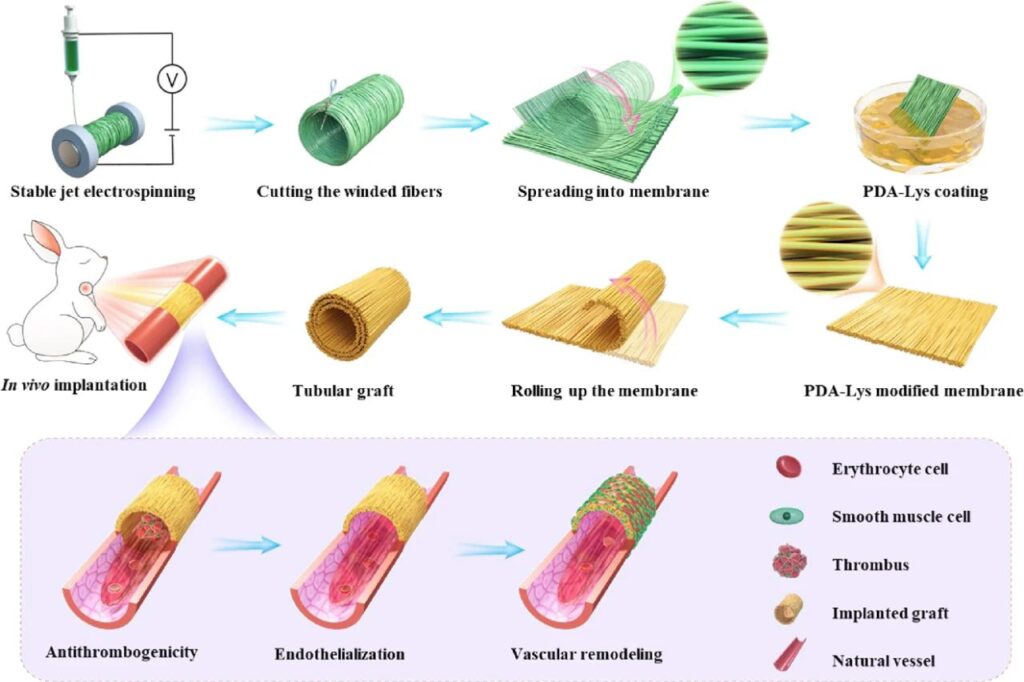 图7. PDA-Lys涂层功能修饰PLCL取向纤维支架促进血管内皮层再生示意图。