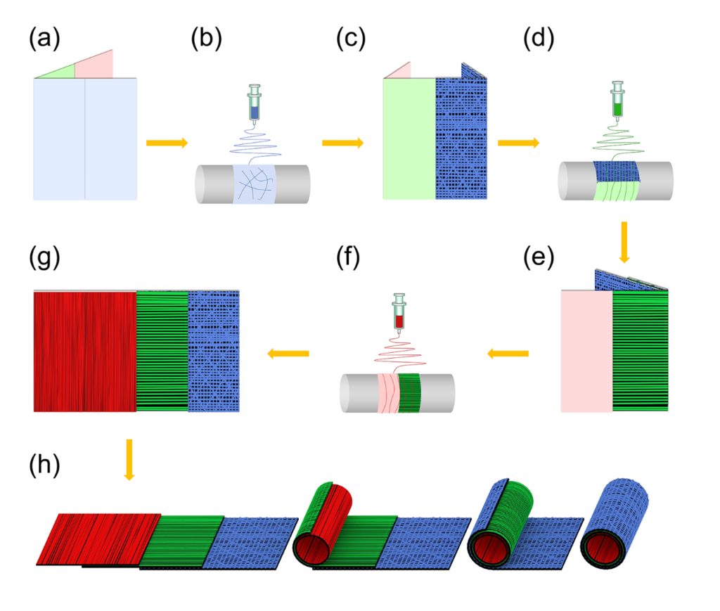 细胞的空间排列和三层结构对天然血管的生理功能至关重要。然而,很难在一个支架中同时实现这两种特性的构建。目前大部分三层血管支架的制备过程复杂且不可控。鉴于此,研究人员报告了一种明胶基仿生三层结构及空间排列的血管支架构建策略。研究通过分步静电纺丝技术,按序制备一个随机取向的纤维层和两个定向排列的纤维层,结合折叠和滚动操作获得三层血管支架。结果表明,三层血管支架具有很大的潜力,可以仿生天然血管三层结构并引导类似天然血管细胞的空间排列,从而进一步促进血管的全面重建和再生。