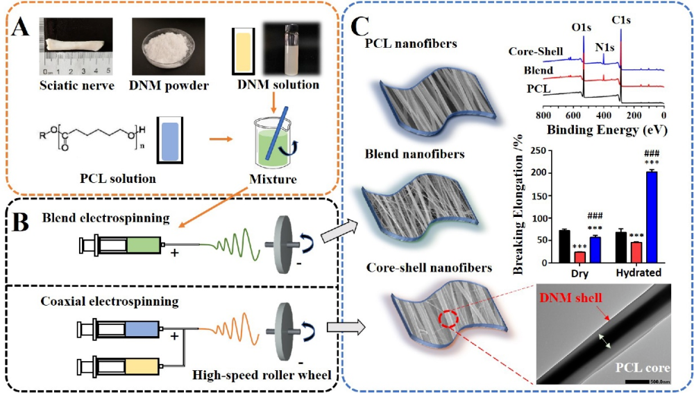 在周围神经损伤治疗中,生物材料修复的关键策略是赋予支架必要的物理拓扑信号和生物化学信号,从而促进神经轴突的生长和定向延伸。为了模拟存在位于神经细胞外基质中的微纳米纤维结构,研究人员尝试在取向排列的聚合物纤维上涂覆DNM水凝胶,但复合支架的纤维拓扑结构会被高浓度水凝胶覆盖,弱化了物理诱导细胞。因此,在该研究中基于周围神经去细胞基质和聚己内酯(PCL),通过静电纺丝技术制备得到两种不同组成和分布的复合纤维,系统地比较了两种复合纤维在物理化学性能和生物功能性上的差异,为去细胞基质在组织工程上的应用提供了一种新的可行方式。