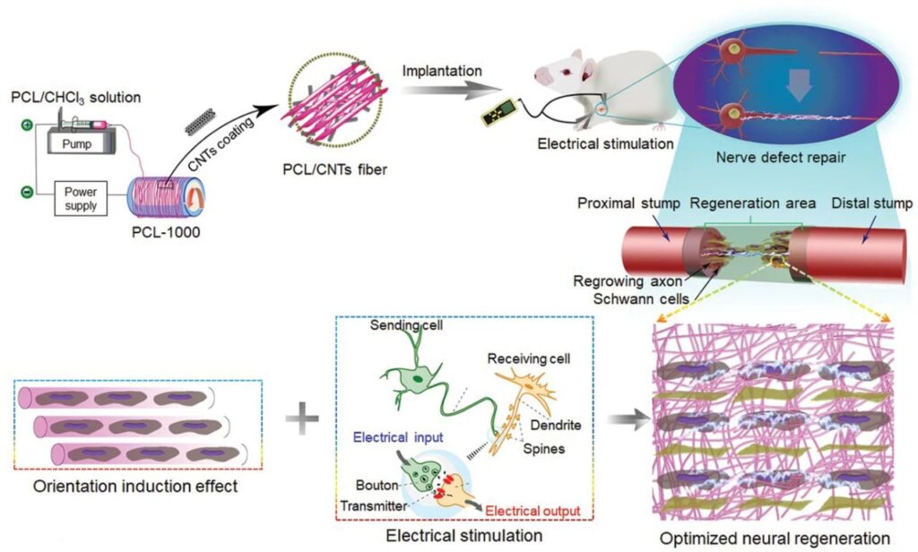遭受周围神经损伤的患者越来越多,为了成功地再生天然神经,近年来神经导管(NGCs)逐渐出现在临床研究中。当前人工神经支架领域的研究进展主要集中在支架结构的设计方面,这些带有微米或纳米结构的图案可在体外积极影响细胞,如促进细胞迁移和引导神经突沿纤维轴向生长。除了纤维的取向之外,基质材料的生物电特性是另一个直接影响细胞活动的关键因素。研究人员将线性排列的纤维与高导电性材料结合起来,研究了在电刺激(ES)下纤维的排列形貌对神经元细胞的体外生长行为和体内神经缺损修复的影响。该研究提出的具有优化排列的导电PCL/ CNTs复合纤维能够显著促进髓鞘和轴突再生,使用PCL/CNTs-1000+ES支架修复的神经在步行轨迹分析、电生理性能和组织学结果方面均表现出了一定的优势,因此在治疗物理性周围神经损伤领域具有良好的应用前景。