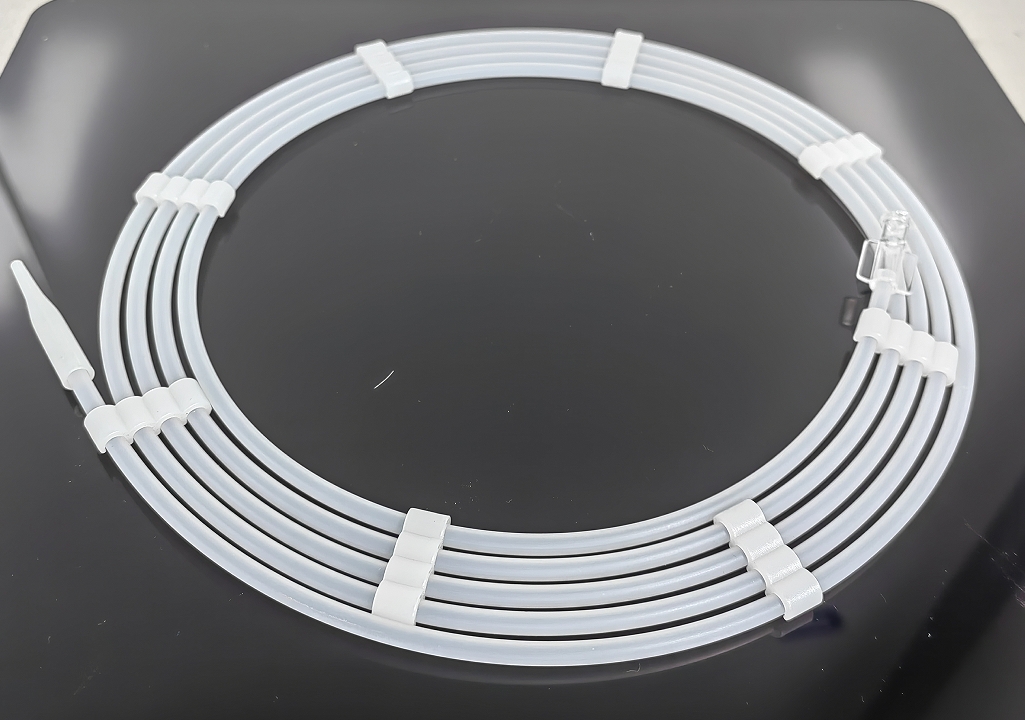 钳道管:单层管/三层复合管,尺寸可定制; 材料有PEBAX/TPU/PTFE等,可供插入管内部的器械通道; 蛇骨弯曲橡皮管:弹性薄壁管,材料有TPU80A-85A, 壁厚0.06-0.2mm不等,尺寸可定制。