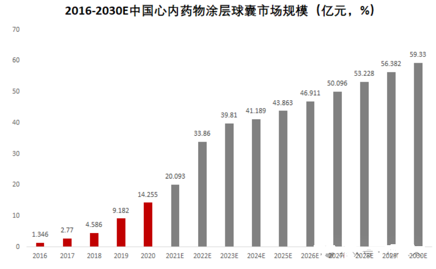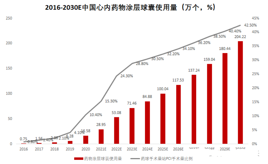 随着近年来“介入无植入”理念的推广,药物涂层球囊使用量快速增长。根据弗若斯特沙利文预测数据,药物涂层球囊首次在中国获批用于冠状动脉疾病的治疗后,使用量从 2016 年的 7500 个大幅增长至 2021 年的 29.0 万个。预计 2025 年市场规模将进一步攀升至 100.0 万个,2030 年预计将达到 204.2 万个。