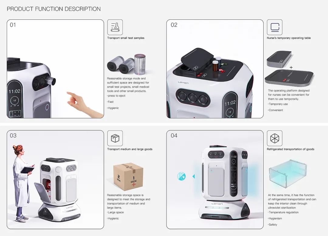 该机器人集成了大型医疗用品、小型测试样本和冷藏物品的运输,能够为医院内部提供全方位的货物运输服务。