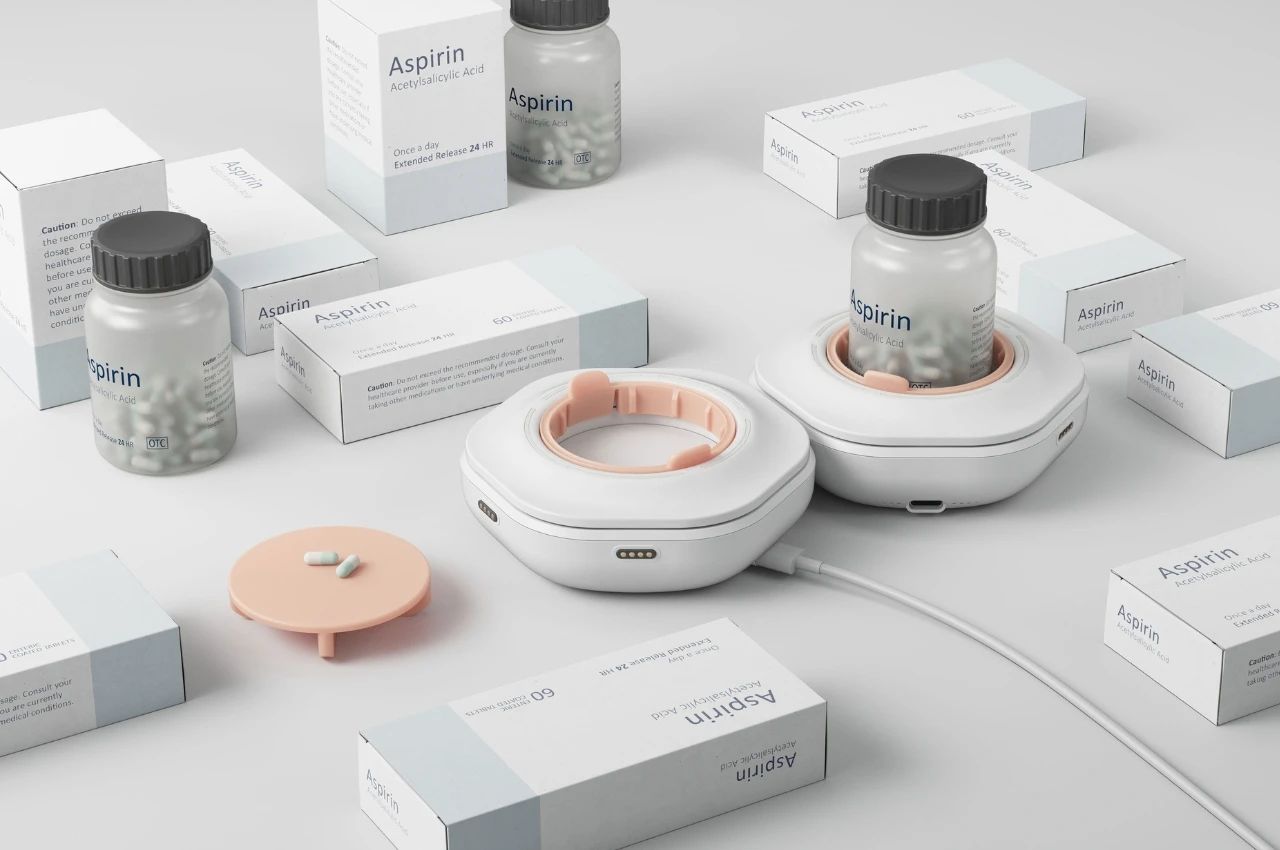 外观设计成可互连的模块化吊舱,每个吊舱中央有空间放置药瓶,底部配有橡胶底座。