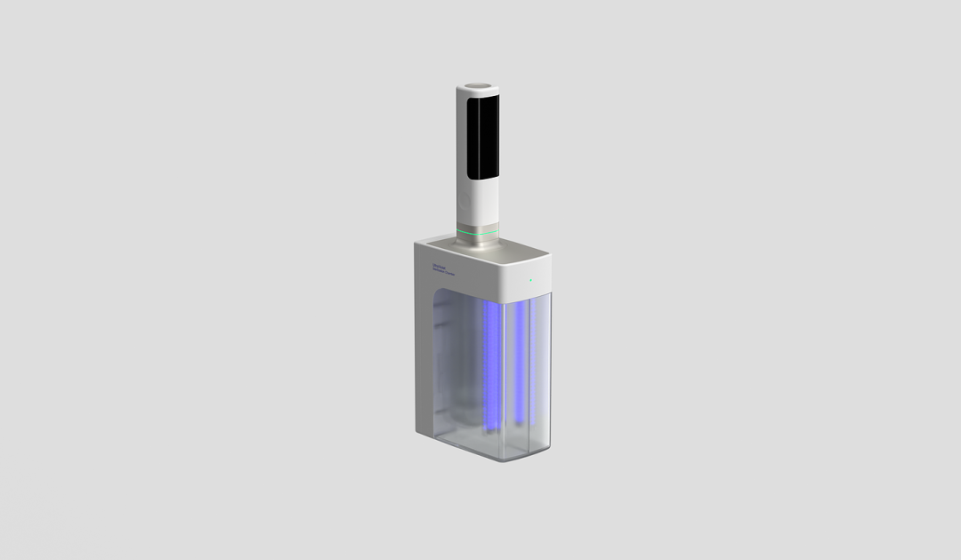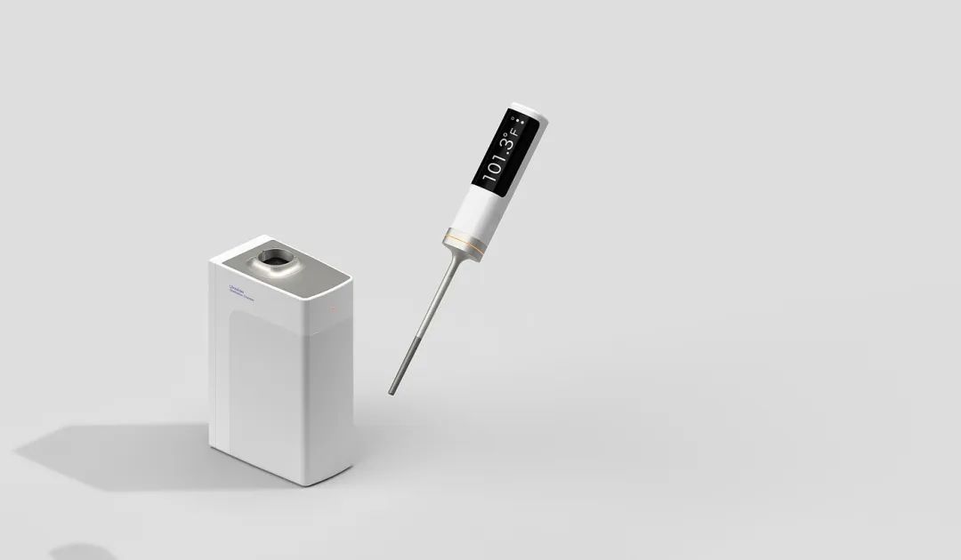 这是一款为医院设计的可持续性的紫外线消毒温度计。根据数据调查,医院每年都会扔掉数以百万的温度计,造成电子废物增多。