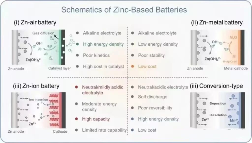 基于金属锌负极的新兴锌基电池系统,主要包括锌空气电池、锌金属电池、锌离子电池和基于其他转换反应的电池,如锌碘电池、锌溴电池和双电子锌锰电池。下图展示了不同的锌基电池的原理,储能机制和优缺点。