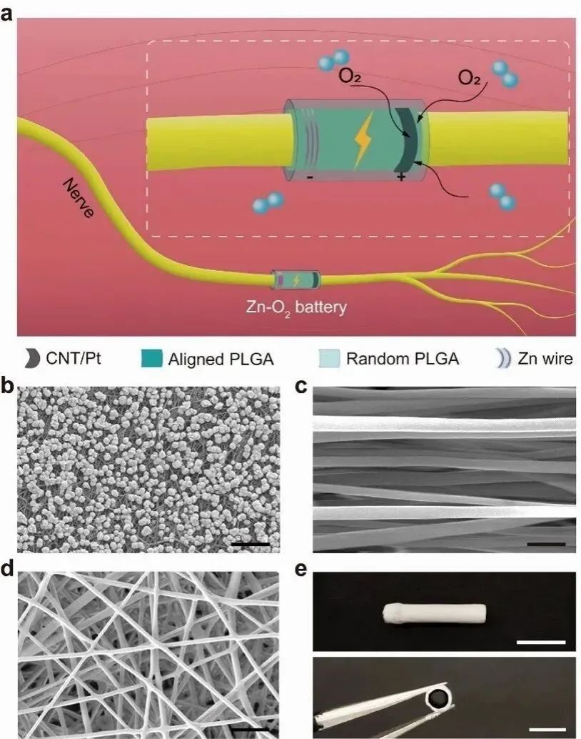 锌氧气电池的正极是碳纳米管/铂复合薄膜,负极是锌丝。正负极固定在管状的取向聚乳酸-羟基乙酸共聚物(PLGA)膜上,外层包裹多孔PLGA薄膜以提供力学支撑。锌氧气电池利用体液作为电解液,利用体内的氧气实现放电。