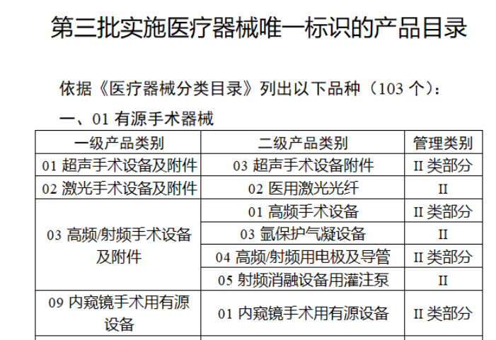 其中提到:按照风险程度和监管需要,确定部分临床需求量较大的一次性使用产品、集中带量采购中选产品、医疗美容相关产品等部分第二类医疗器械作为第三批医疗器械唯一标识实施品种,产品目录如下: