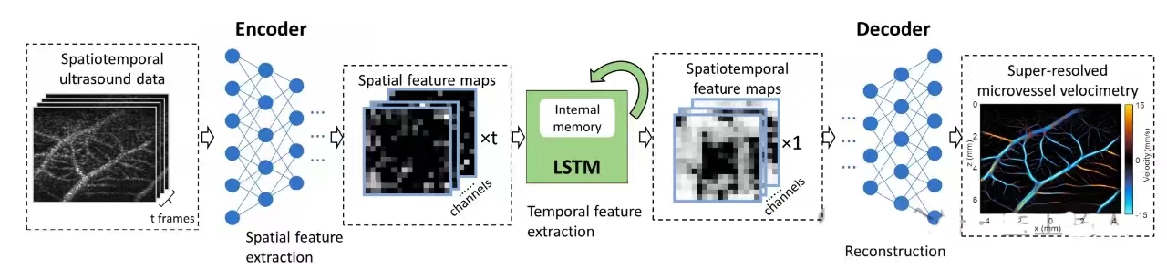 本研究的核心在于开发一种名为Deep-SMV的超分辨率超声成像技术,这种技术利用长短期记忆(LSTM)神经网络来处理高浓度微气泡的超声数据,并直接输出高精度的血流速度测量。这一突破性技术有效解决了传统超分辨率超声成像中成像速度慢和分辨率限制的问题,实现了真正的实时速度图重建,适用于功能性血管成像和脉搏图映射。