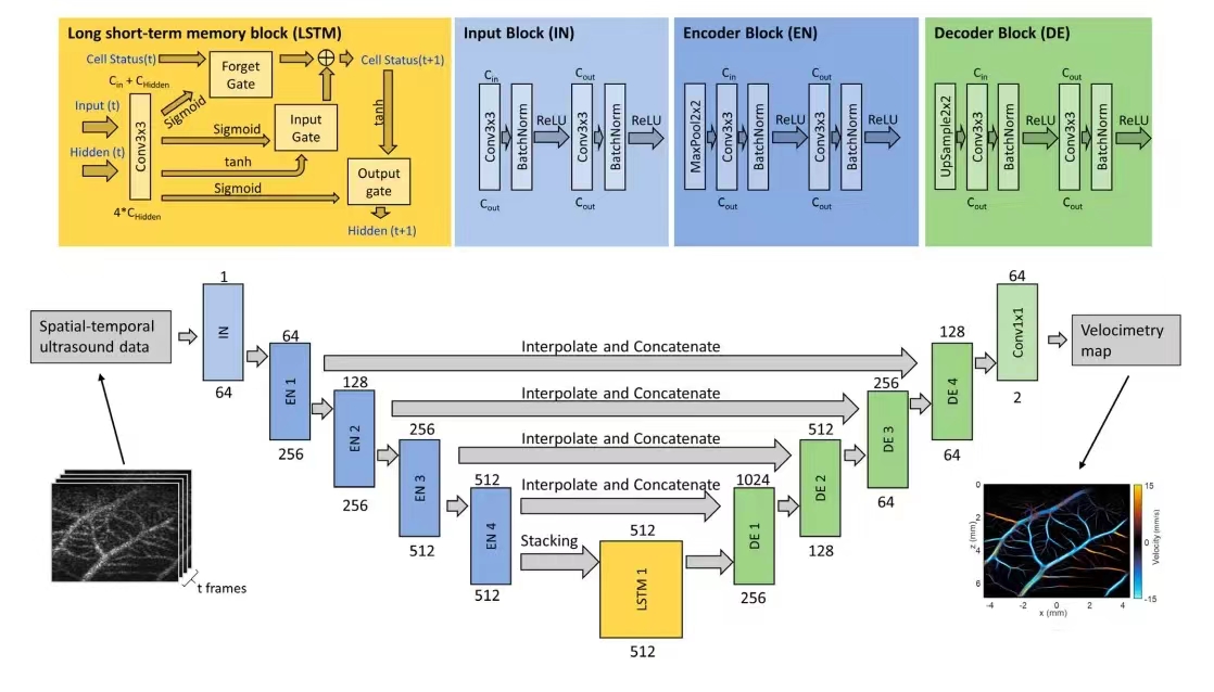 Deep-SMV 的深度神经网络架构。主网络设计是经典的UNet结构,在瓶颈层中使用长短期记忆(LSTM)块来提供流速测量,输入由时空(2D空间+时间)超声数据和输出组成 超分辨率速度和结构图。图顶部详细提供了 LSTM、输入、编码器和解码器模块设计。每个块上方的文本表示单元的输入通道大小,每个块下方的文本表示单元的输出通道大小