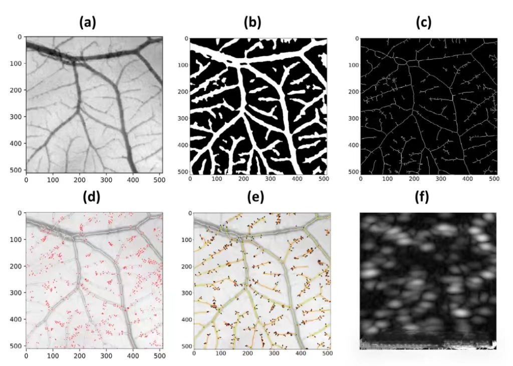 基于CAM的MB流模拟程序。(a) CAM 光学图像中 512 x 512 像素区域的绿色通道像素强度的灰度图像。(b)通过应用自适应阈值处理(a)的二进制分割结果。(c) 通过对 (b) 应用中轴骨架化而获得 (b) 的骨架。(d) 由骨架 (b) 构建的无向图,显示在原始 CAM 图像之上。线代表边,点代表顶点。(e) 最终定向血管图,箭头指示每个血管段上的流动方向。(f) MB 流模拟中的 Field-II 超声模拟示例框架。