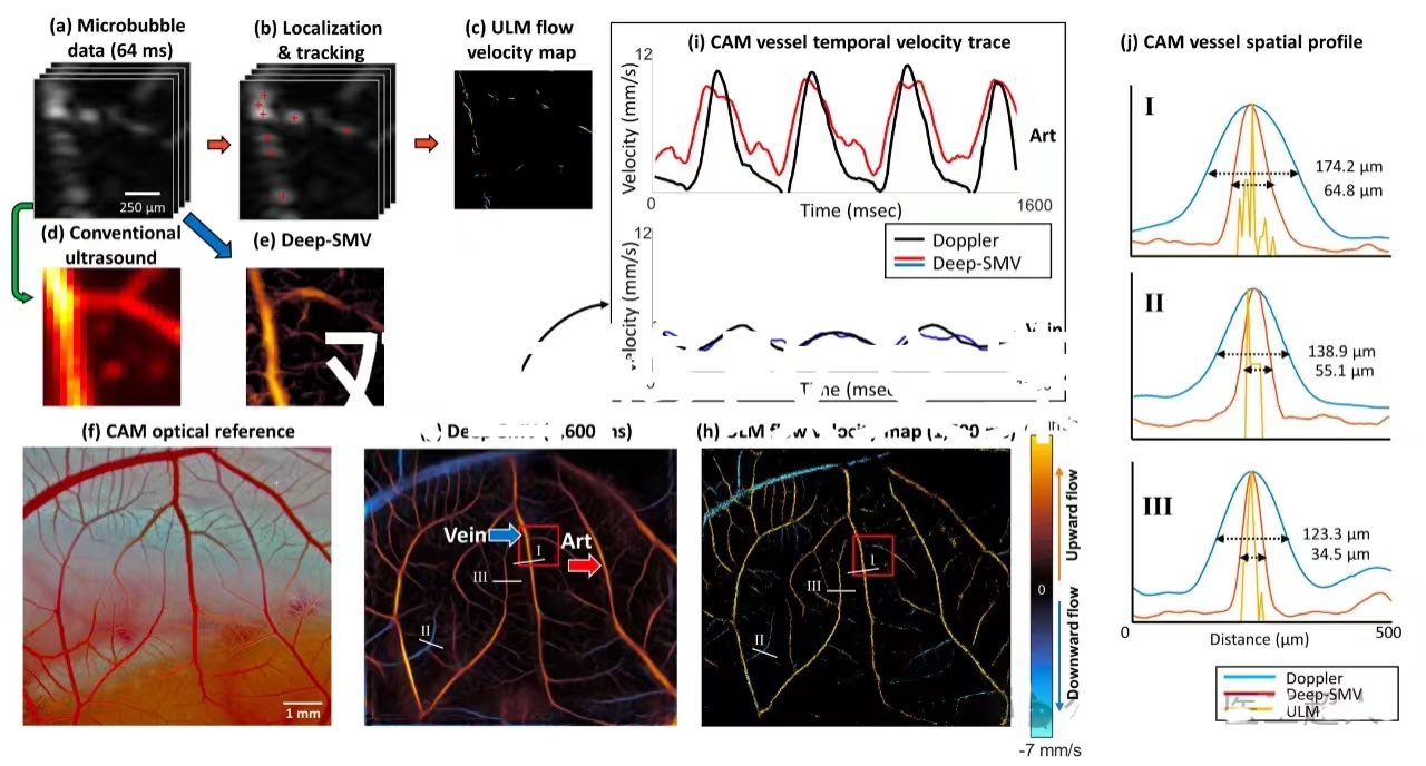CAM 血管数据的 Deep-SMV 工作流程。(a) 使用 (b) 传统的 ULM 定位和跟踪处理 MB 数据的示例短数据段 (64 ms),从而得到 (c) 非常稀疏的流速图,其中很难可视化微血管解剖结构。(d) MB 信号数据的直接累积揭示了衍射极限血管结构。(e) 使用 Deep-SMV 处理相同的数据段可以进行超分辨率速度估计,并且比传统的 ULM 具有更多的结构连接性。(f)-(h) 大视场长数据段上的 Deep-SMV 和 ULM 性能比较。(i) Deep-SMV 在从供给 (Art) 和引流 (Vein) 脉管系统采样的局部区域显示出明显的脉动特征,这与传统的多普勒速度测量相匹配。(j) 通过功率多普勒、Deep-SMV 和 ULM 重建的 FWHM 测量的三个不同尺寸血管的直径。
