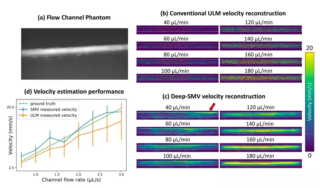 Deep-SMV在多种成像场景中展示了其卓越性能,包括流动通道模型、鸡胚的绒毛膜和小鼠的大脑成像。该技术不仅处理速度快,成像质量也显著优于传统方法。实验结果表明,Deep-SMV能够在短时间内完成高质量的血管成像,显示了其在临床和科研应用中的巨大潜力。