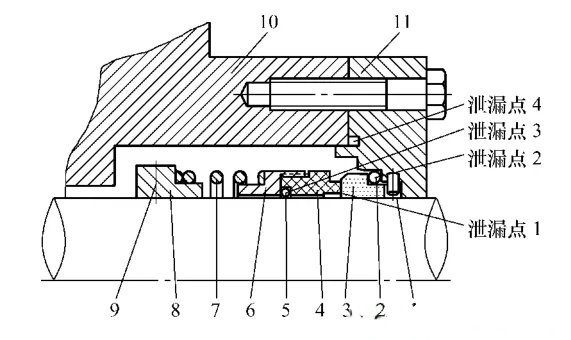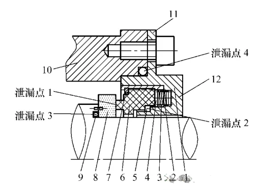 当密封腔内充满有压的被密封介质时,由图1所示机械密封的泄漏点主要有4处: