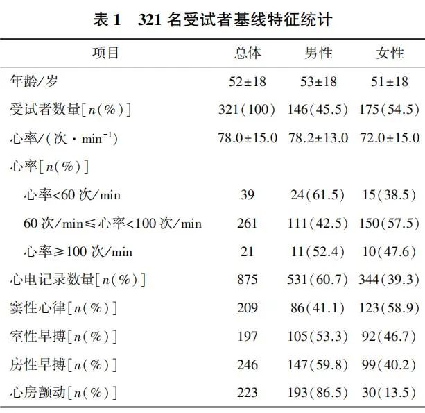 本研究共招募受试者369名,采集到983份心电记录。根据纳入及排除标准排除因通信原因未查询到记录的20名成年受试者(20条心电记录)、1名未成年受试者(1条心电记录)和诊断结果不确定的27名受试者(87条心电记录)后,最终共计入选受试者321人(875条心电记录),其中男性146人(531条心电记录)、女性175人(344条心电记录)。部分入选受试者的心电记录中同时存在“不确定”记录和有效诊断记录。其中,“不确定”记录被删除,有效诊断记录被保留。