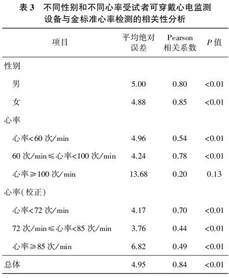通过对受试者进一步分层,分析在不同性别和不同心率的情况下两种检测方法的相关性(表3)。男性和女性受试者中,12导联心电图机与可穿戴设备检测的心率高度相关(P均<0.01)。当心率<100次/min时,12导联心电图机和可穿戴设备检测的心率相关性较强。然而,当心率≥100次/min时,平均绝对误差较大(13.68),且相关性较弱(0.20),这可能是由于受试者数量较少(心率≥100次/min的受试者仅有60条记录)导致的。我们进一步对心率区间进行了调整,以保证每个区间的数量保持一致,选择两个合适的心率截断值(72、85次/min)。当心率<72次/min时,该区间包含283条心电记录,两种方法检测的心率值相关性较强。当72次/min≤心率<85次/min时,该区间包含291条心电记录,两种方法测得的心率值相关性有所减弱。当心率≥85次/min时,该区间包含300条心电记录,两种方法检测的心率相关性较强。